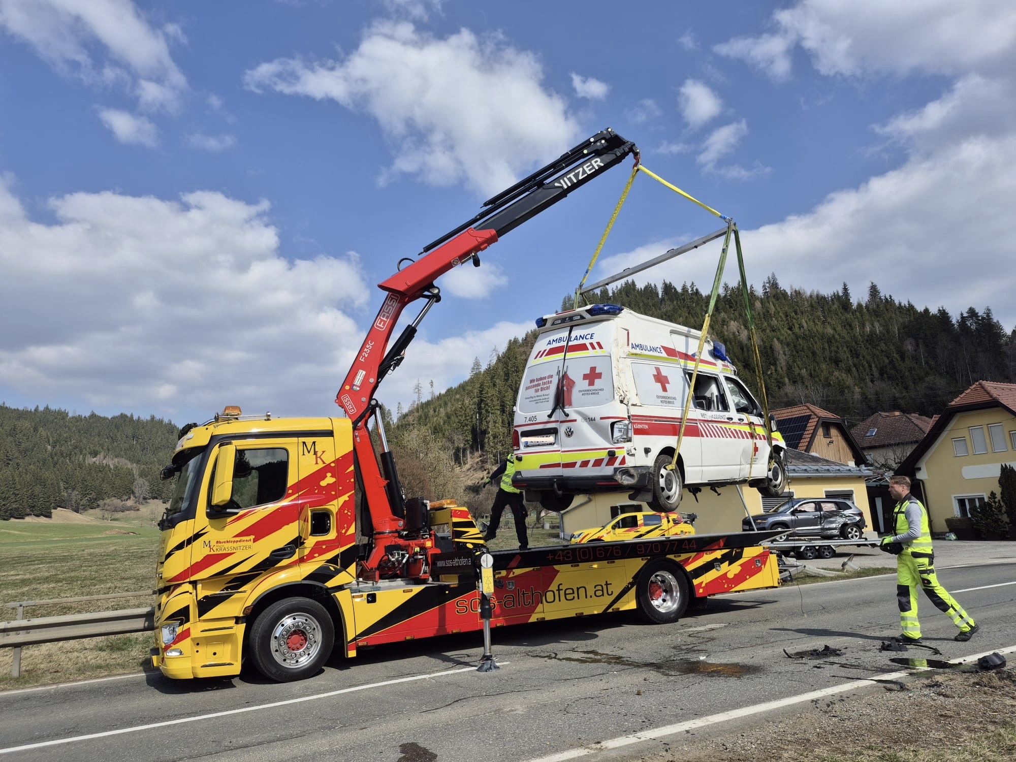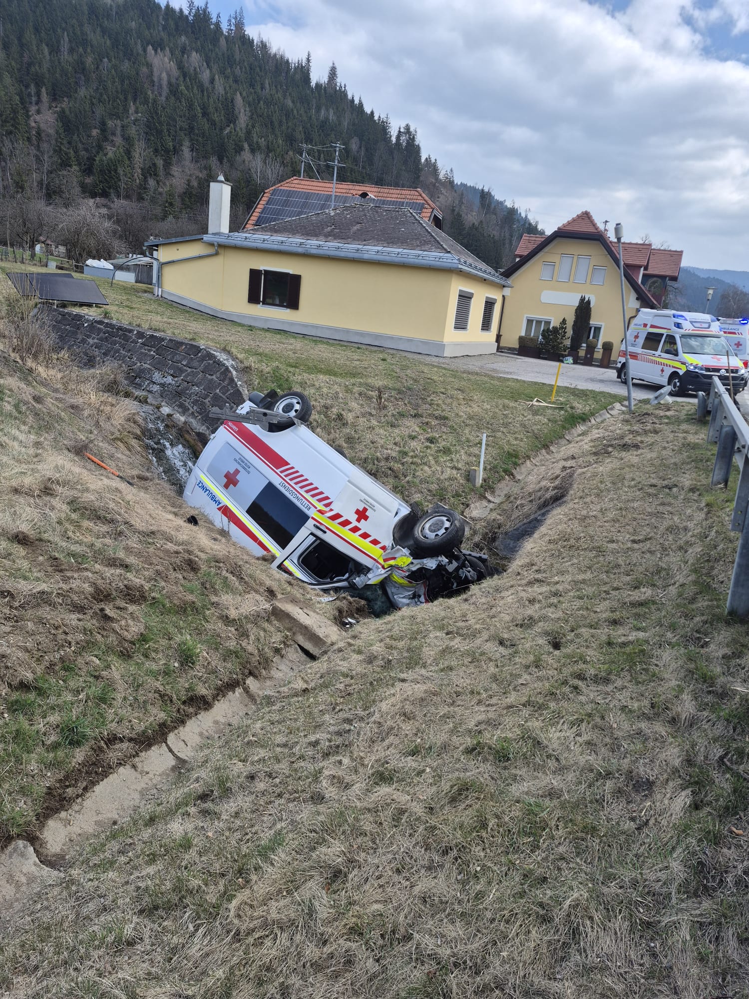 Durch den Zusammenstoß kam der Rettungswagen von der Fahrbahn ab und landete in einem Straßengraben. Alle 4 Verletzten der beiden Unfallfahrzeuge wurden ins Krankenhaus Friesach gebracht.